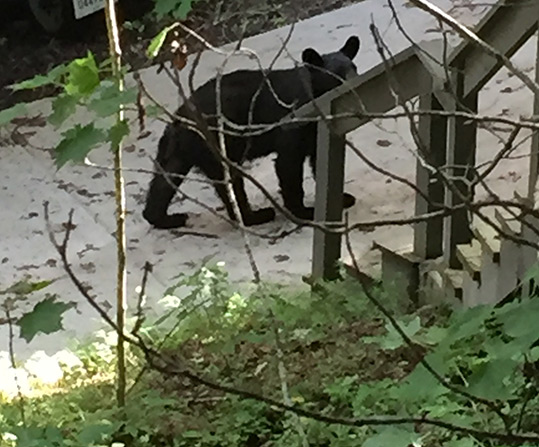 He stopped again, just past the boat house, and looked up the stairs leading up to our deck and porch where we were standing. I thought for a second, he was going to walk up the steps toward us. Had he done that, we would have quickly retreated into our home. Paula took the photo below with her phone. He decided to keep walking along the drive and disappeared into the forest.